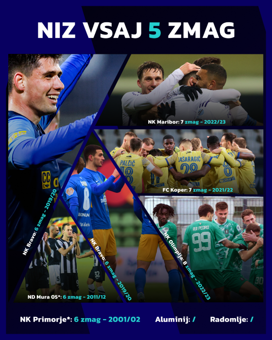 Koper beleži eno boljših sezon, potem ko je lani pod Slavišo Stojanovićem dolgo bil neporažen (največ štiri zaporedne zmage v ligi) in prišel v finale, letos pa ima pod Zoranom Zeljkovićem najdaljši niz treh zmag na prehodu iz jesen v pomlad. In od kdaj se niso ostrigli? Čeprav je Koper osvojil naslov v 2009/10, ko so vmes zabeležili niz štirih zmag, pa je njegov najdaljši niz iz sezone 2021/22, ko so vse do konca spet bili bitko z – Mariborom. Tedaj so jo izgubili, potem ko so imeli izjemen začetek v sezono, ko so po uvodnem remiju z Aluminijem dobili kar sedem tekem zapored, kar je njihov najdaljši niz v ligi: od 27. julija 2021 do 12. septembra. So bile pa tekme kar rezultatsko pestre. Zmaga doma nad Muro (3:2), slavje v Celju (1:3), nato so padle Domžale (4:2), v gosteh Olimpija (1:3), doma gladko Maribor (2:0), na tesno Tabor v Sežani (0:1) ter nato še Radomlje (1:4).